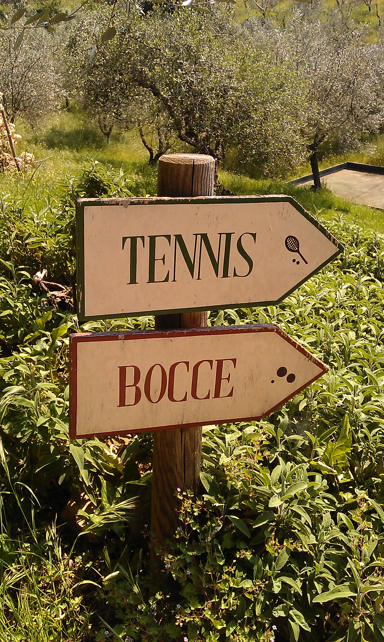 1. og 2. Her på stedet produseres det egen olivenolje, vin og vin santo, som er en slags hetvin. I tillegg selger de lokale skjønnhetsprodukter, som faktisk lukter utrolig godt. Det spørs om ikke noe av det må bli med meg hjem som minne om turen. 3. Dersom jeg skulle føle for å klaske litt tennis, eller spille Bocca, er det gode muigheter for det også.