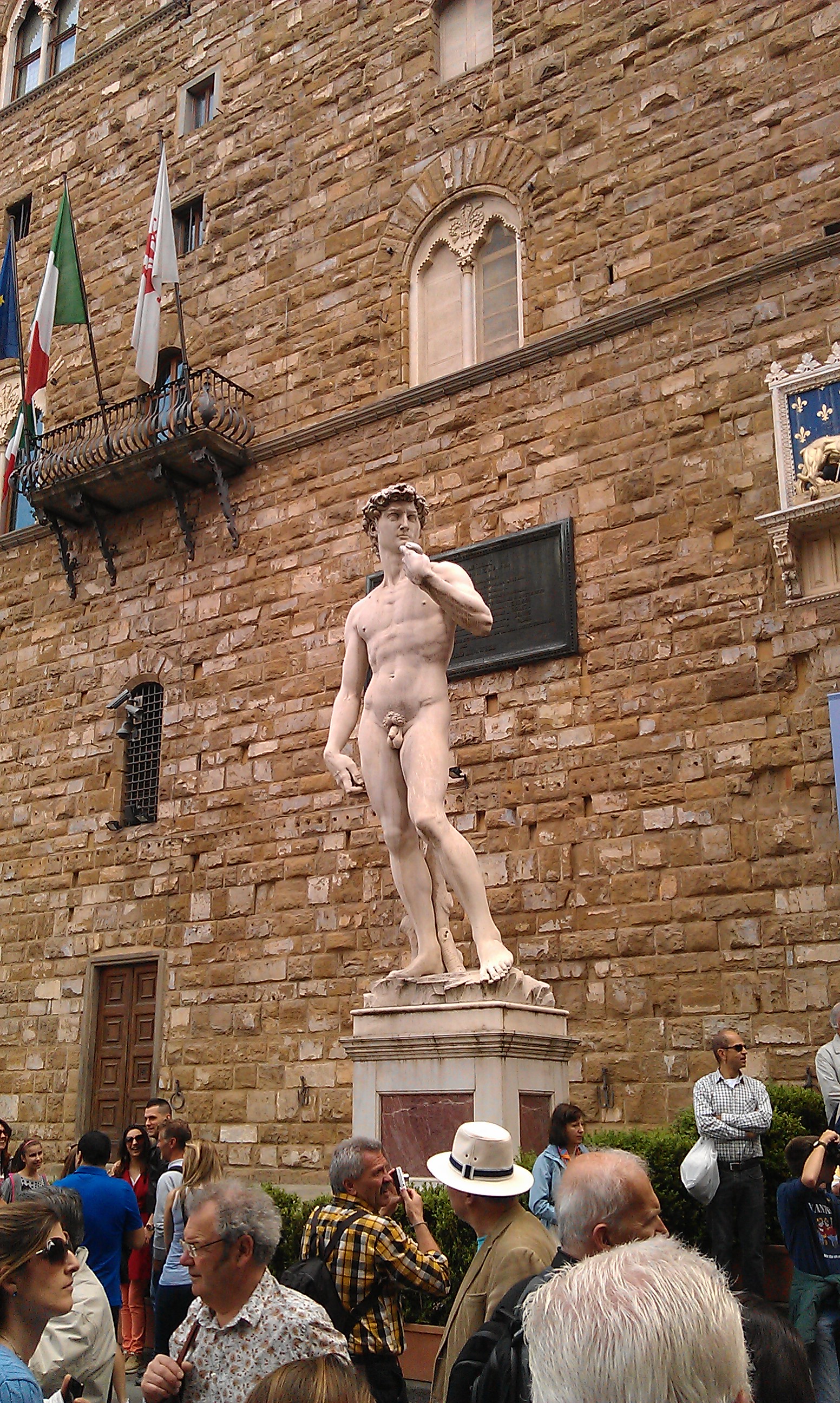 Originalen til David står innendørs, i Galleria dell’Accademia, den er over 5 meter høy. Men nå rekker du kanskje ikke innom der… Kos deg videre med italienske nytelser, det ser ut som du har det svært bra! 🙂