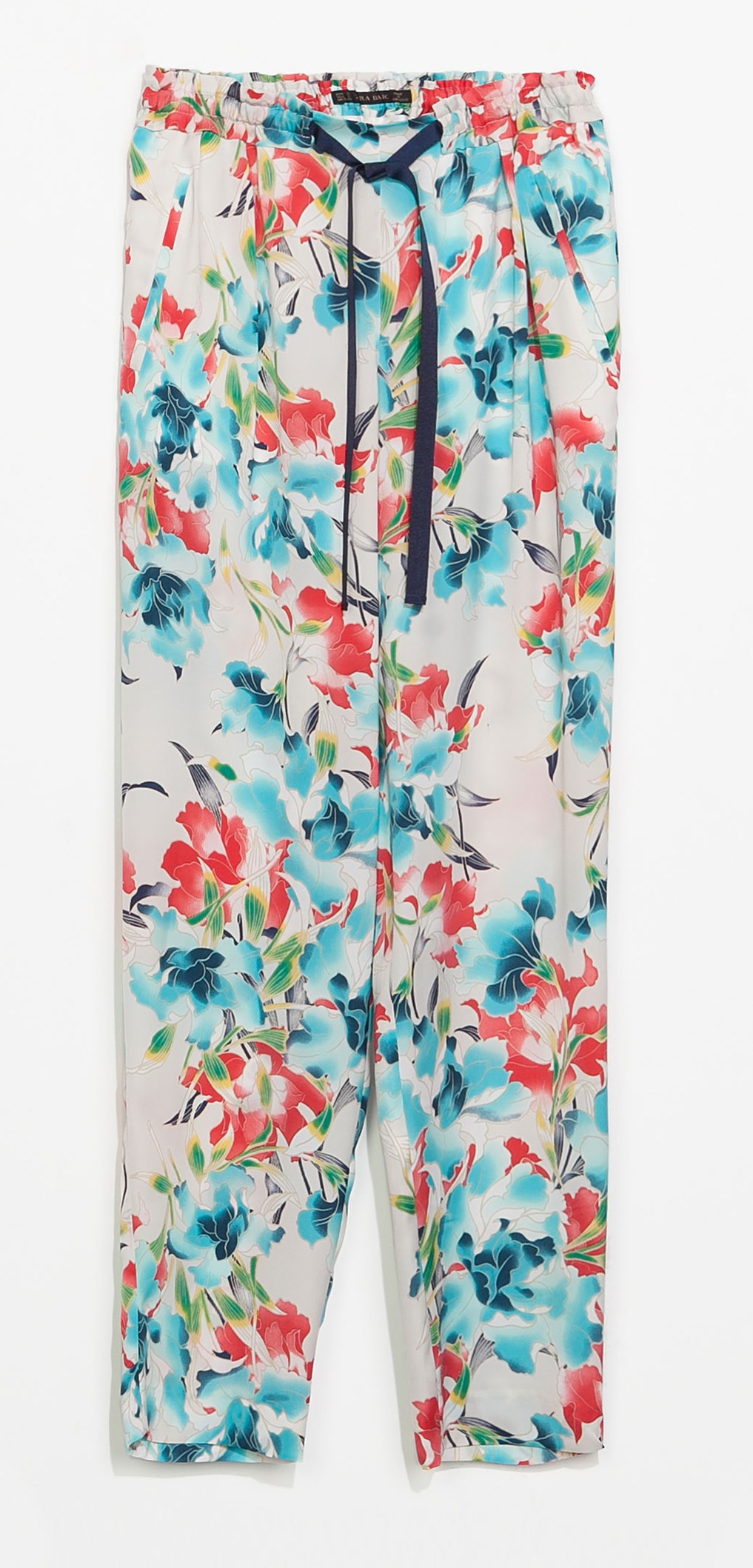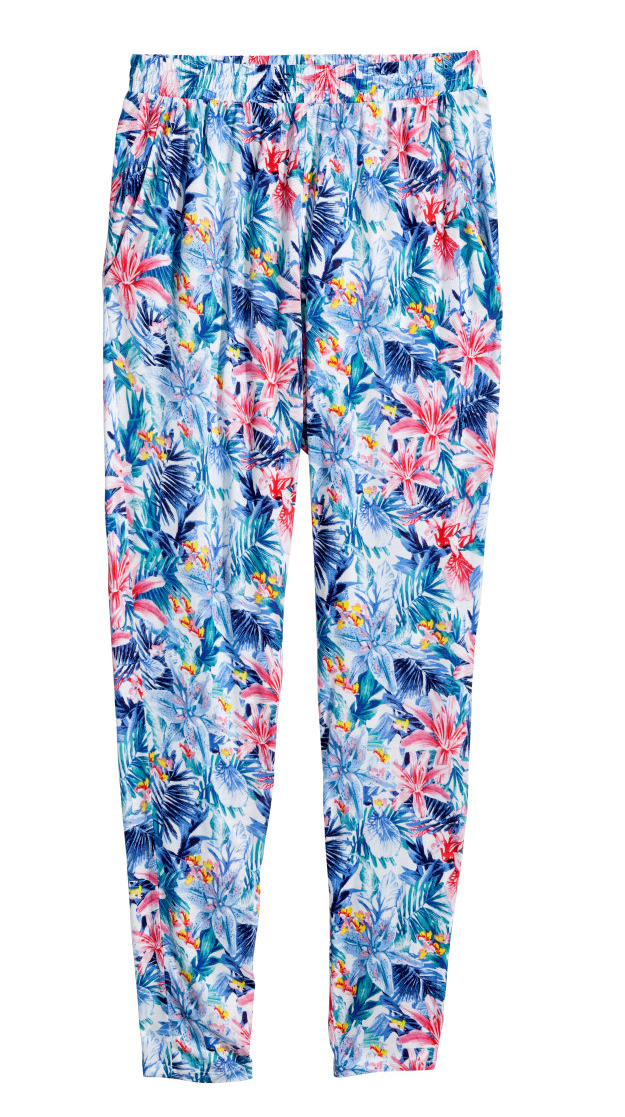 1. Blomstermønstrete bukse fra Zara, kr 299. 2. Blå bukse med snøring fra Zara, kr 299. 3. Tropiskmønstrete bukse fra H&M, kr 149.