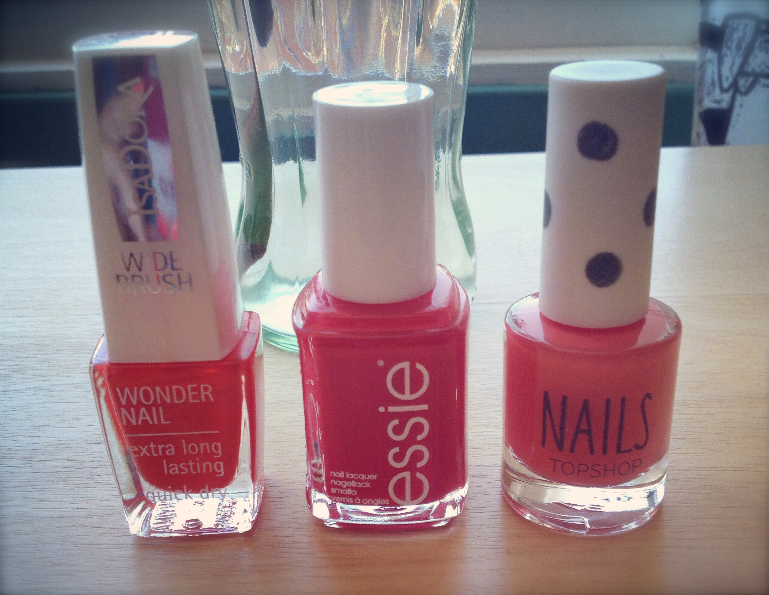 Til høyre: Mitt siste kjøp og souvenir fra London, neglelakken Jump fra Topshop. Denne ligger midt i mellom de to andre, og får en nydelig korallfarget nyanse når du tar den på. Den ser litt rosa ut på flasken, men når du får den på har den heller et oransjeskjær over seg. En helt nydelig sommerfarge!