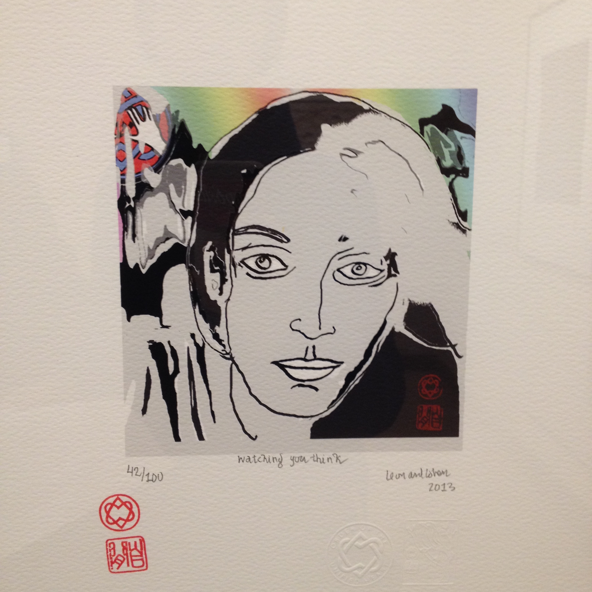 Legg forresten merke til alle vannmerkene og stemplene, som går igjen på verkene hans. Det i ringen ligner på David-stjernen, men er sammensatt av to hjerter om du titter nøye etter. Som er vevd inni hverandre. En orden Cohen selv kaller Order of the unified heart, og som har blitt en signatur på trykkene han lager. Det andre stempelet, som ser ut som stabler med stoler, symboliserer Cohens buddhistiske munkenavn, Jikan, som han fikk etter å ha blitt ordniert som munk i 1996. Jikan betyr den tause.