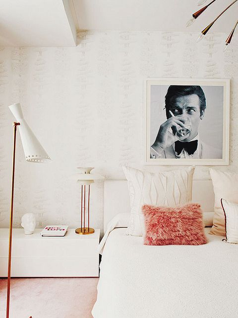 Stilig soverom med sort/hvitt-bilde av Roger Moore over sengen, og med en lodden pute i en kontrastfarge oppi.