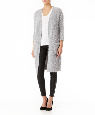 Lang, koksgrå kardigan med sølvtråd, kr 499, og grå genser med løkkestrikk øverst, kr 499, begge fra Lindex.