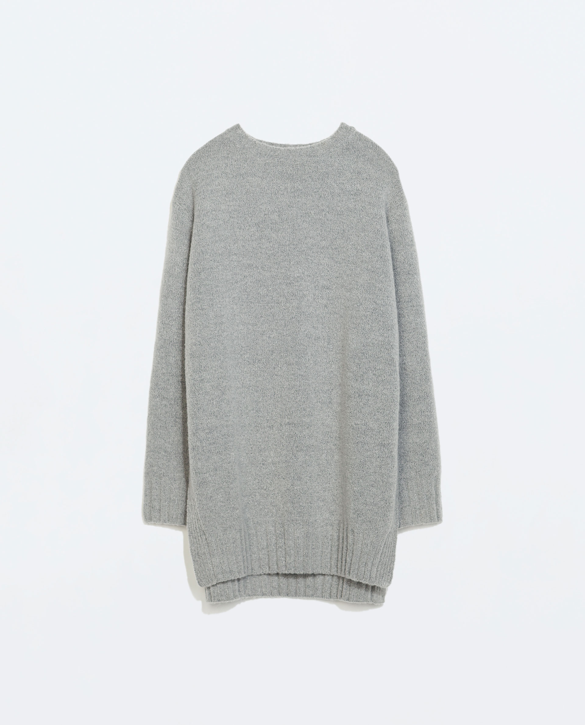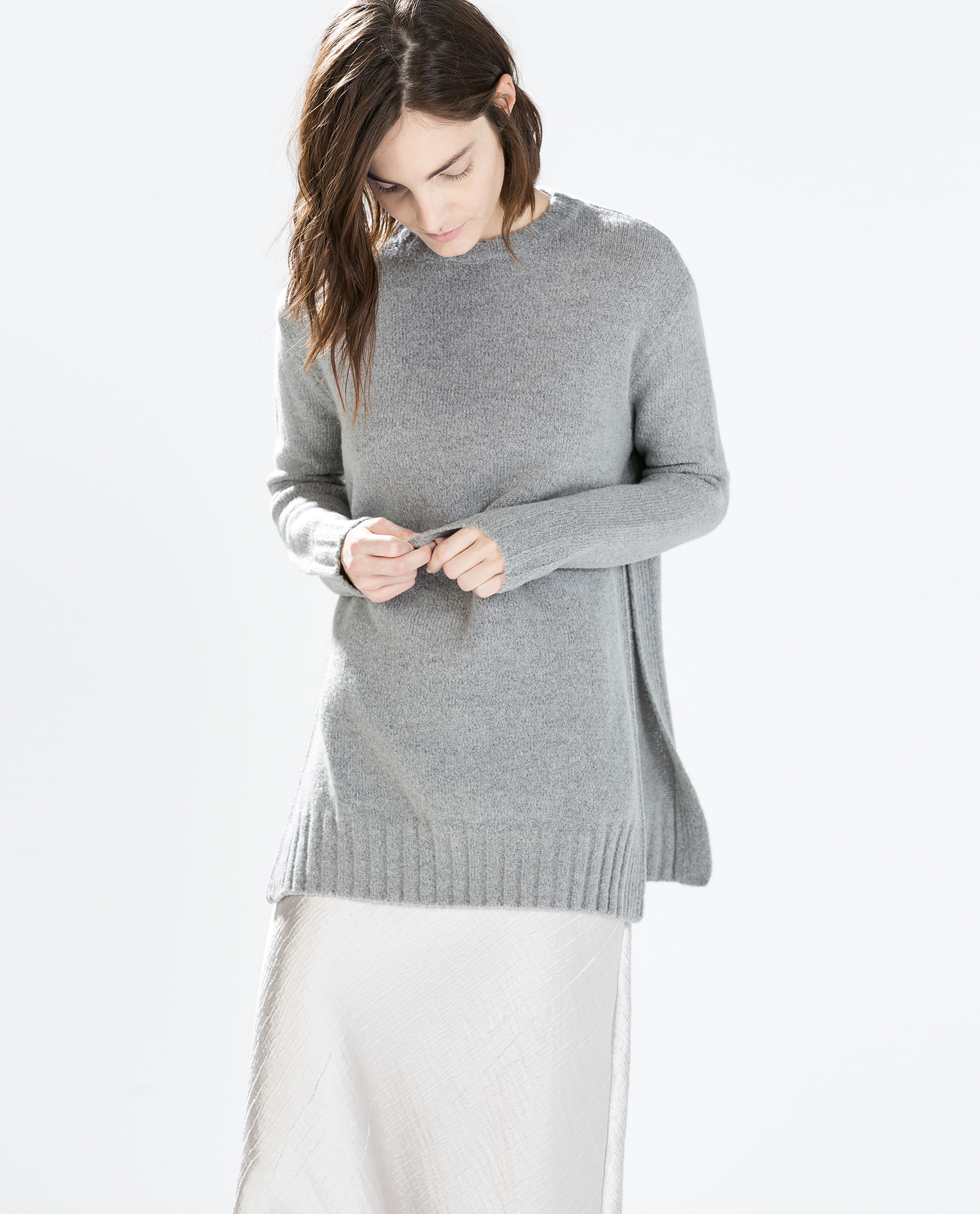 Øverst: Grå strikkegenser med høy splitt i sidene fra Zara, kr 299.