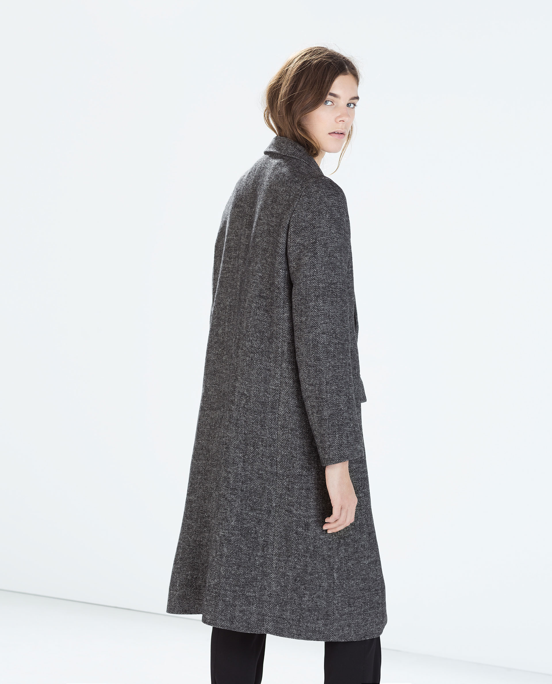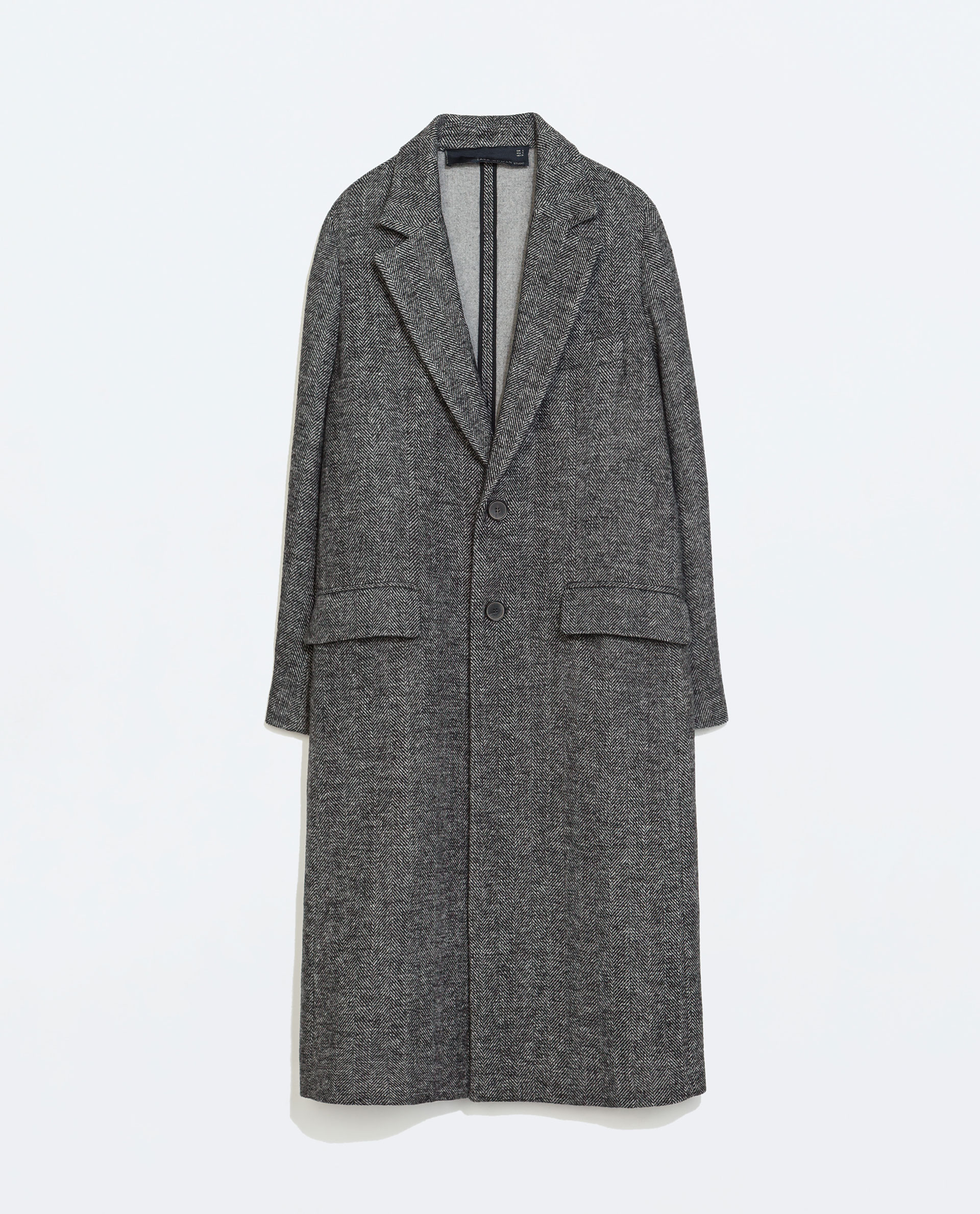 Nederst: Gråmelert, oversized kåpe med fiskebensmønster fra Zara, kr 1795.