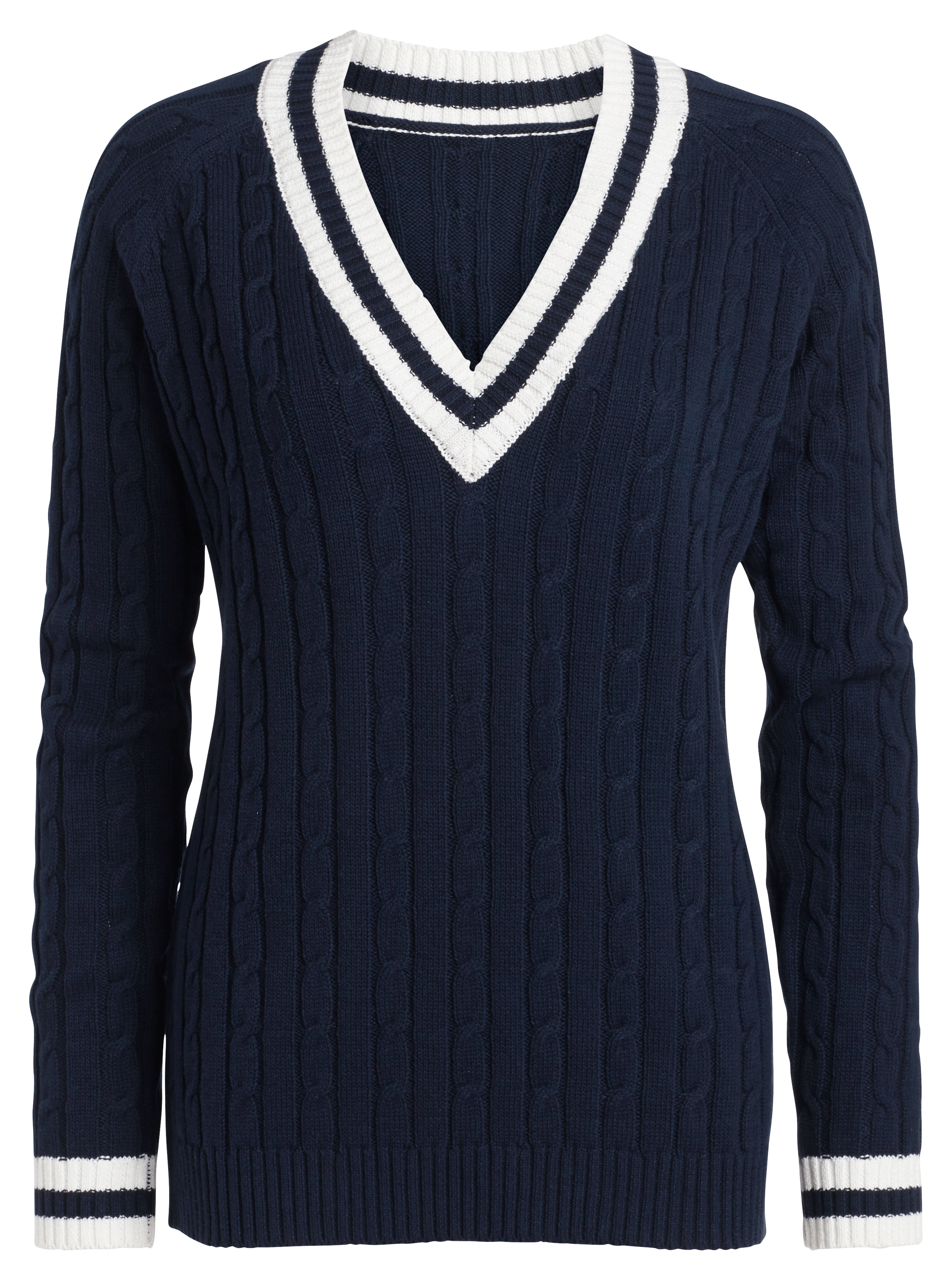 Mørkeblå V-genser med fletter og hvite stripedetaljer fra Kappahl, kr 399.